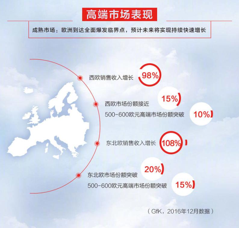 按照華為公布數(shù)據(jù),華為 2016 年在歐洲市場的取得的成績頗為亮眼,不僅是在出貨量和銷售額方面取得了翻倍的增長,在高端市場的份額也獲得了用戶的認(rèn)可,西歐和東歐的市場份額別離突破了10%和20%。作為一個五年前幾乎從零起步的品牌,能夠在今天全球智能手機(jī)的高地有所斬獲并依舊連結(jié)穩(wěn)健增長,預(yù)示著華為登頂歐洲市場的目標(biāo)越來越有望成為現(xiàn)實(shí)。