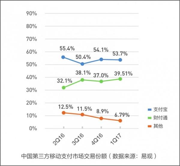 易不雅觀智庫最新發(fā)布的《中國第三方支付移動(dòng)支付市場季度監(jiān)測(cè)陳訴》顯示,2017年第一季度,中國第三方移動(dòng)支付市場交易規(guī)模達(dá)到188091億,,其中支付寶占比53.7%,騰訊財(cái)付通為39.51%,兩家企業(yè)共同占據(jù)移動(dòng)支付市場90%。
