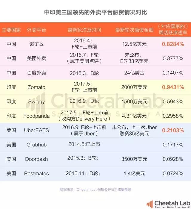 據(jù)Cheetah Lab(原獵豹全球智庫)對美國、印度、中國外賣市場調(diào)查分析顯示,中印外賣平臺的融資數(shù)額可以用天差地別來形容。在圖中,除了Foodpanda這個由Rocket Internet孵化、又被Delivery Hero收購的歐洲訂餐送餐初創(chuàng)企業(yè),跟隨其母公司獲得過上億美元投資,其他兩個本土企業(yè)幾乎沒有一次超過1億美元的融資。即使是Swiggy近期才獲得了由Naspers領(lǐng)投的8000萬美元,也難以和動輒十億或二十億美元的我國外賣平臺比擬,因此確實很難毫無顧忌地進行燒錢大戰(zhàn)。