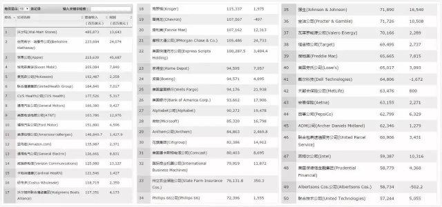 財(cái)富中文網(wǎng)發(fā)布2017年《財(cái)富》美國500強(qiáng)排行榜。榜上全部500家公司總收入達(dá)12.06萬億美元,較去年的11.99萬億美元提升了0.58個(gè)百分點(diǎn),這些美國最大企業(yè)的總利潤近8900億美元,較去年增長了近6個(gè)百分點(diǎn)。其中,沃爾瑪連續(xù)第五年蟬聯(lián)榜首,巴菲特的伯克希爾-哈撒韋公司緊追其后,位列榜眼。排名第三的蘋果公司則繼續(xù)連結(jié)利潤榜的第一,成為最賺錢的美國500強(qiáng)公司。Facebook首次進(jìn)入百強(qiáng)公司陣營,從157位躍升至98位。受中國用戶關(guān)注的電動車公司特斯拉首次進(jìn)入500強(qiáng),位居第383位。