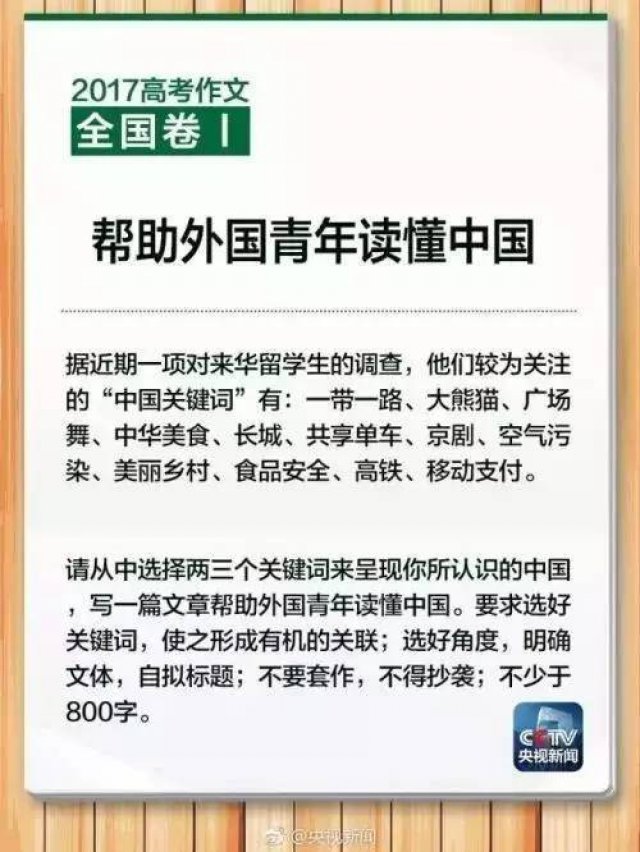 本年的高考語文作文標(biāo)題問題關(guān)注了多個(gè)互聯(lián)網(wǎng)熱點(diǎn),其中包孕對“共享單車”、“移動支付”等話題的探討?!度珖鞩:老外眼中的中國關(guān)鍵詞》的標(biāo)題問題是,據(jù)近期一項(xiàng)對來華留學(xué)生的調(diào)查,他們較為關(guān)注的“中國關(guān)鍵詞”有:一帶一路、大熊貓、廣場舞、中華美食、長城、共享單車、京劇、空氣污染、斑斕鄉(xiāng)村、食品安適、高鐵、移動支付。請從中選擇兩三個(gè)關(guān)鍵詞來呈現(xiàn)你所認(rèn)識的中國。