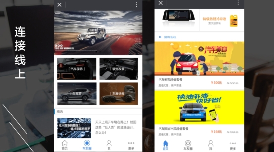 我們以汽修店為例,傳統(tǒng)的線下門店,不具備線上傳播的能力和途徑。連線上的基本辦事展示都無法做到。門店做不到讓用戶在線上選購辦事,到門店來使用辦事。但微信小程序在針對這種困境,有本身的解法。