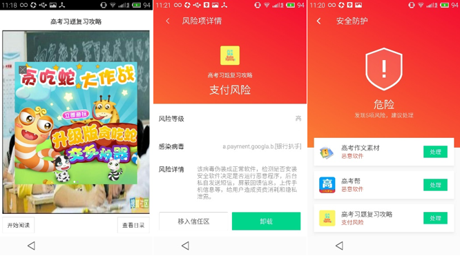 其中,“高考習題復習攻略”偽裝成正常軟件,實則包羅名為“a.payment.googla.b.[銀行翦綹]”病毒,能夠檢測是否安置安適軟件決定是否運行惡意程序,后臺私自發(fā)送短信,屏蔽回饋信息,上傳手機信息等,給用戶造成資費消耗和隱私泄露。