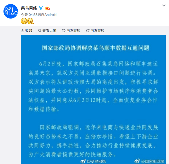 作為回應(yīng),今日早上4點(diǎn)38分,菜鳥網(wǎng)絡(luò)也在官方微博發(fā)布《國家郵政局協(xié)調(diào)解決菜鳥順豐數(shù)據(jù)互通問題》的截圖,并配上“鼓掌”心情。國家郵政局的通知中提到,“雙方同意從6月3日12時(shí)起,全面恢復(fù)業(yè)務(wù)合作和數(shù)據(jù)傳輸”。