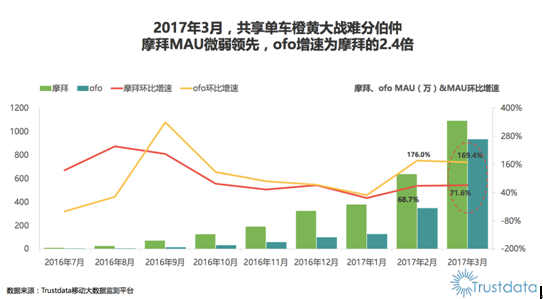 2017年 3 月ofo月活用戶環(huán)比增速為169.4%,遠(yuǎn)超摩拜71.6%的增速,是摩拜月活用戶增速的2. 4 倍。需注意的是,ofo月活用戶的環(huán)比增速已連續(xù) 7 個(gè)月超越摩拜。