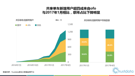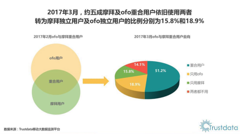 早在本年 3 月,氣溫回暖之時,這種現(xiàn)象就得到了客不雅觀數(shù)據(jù)的印證。按照Trustdata發(fā)布的《 2017 年Q1 中國共享單車行業(yè)用戶監(jiān)測陳訴》, 3 月轉(zhuǎn)為摩拜獨(dú)立用戶及ofo獨(dú)立用戶的比例別離為15.8%和18.9%,ofo的獨(dú)立用戶約為摩拜的120%,可見ofo更受用戶偏愛,相信這一趨勢在夏季更加明顯。