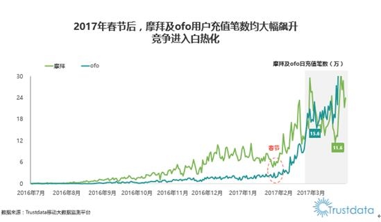 而與Trustdata此前發(fā)布的3月份共享單車的日充值筆數(shù)比擬,可以看到在3月共享單車日充值筆數(shù)的峰值為94.3萬。數(shù)據(jù)表白僅在3月到4月的短短一個月中,共享單車的充值峰值就提升了25%以上,足見用戶對于共享單車的喜愛。同時,付費用戶數(shù)量的上升,也讓人看到了共享單車盈利的可能。隨著用戶付費習(xí)慣的不停強化、新盈利模式的不停探索,共享單車長期被詬病的盈利難題或?qū)⒌玫骄徑狻?/p>