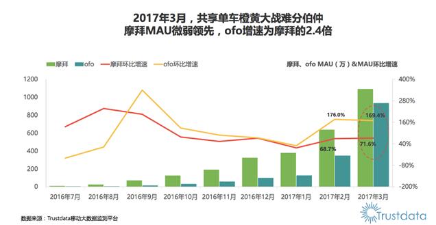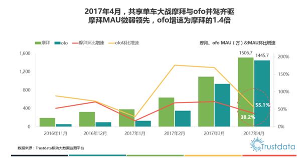 需注意的是,Trustdata發(fā)布的《 2017 年Q1 中國共享單車行業(yè)用戶監(jiān)測陳訴》數(shù)據(jù)顯示,ofo月活用戶的環(huán)比增速已連續(xù) 7 個月超越摩拜。如今,ofo4 月用戶增速再次超越摩拜,創(chuàng)下用戶增速連續(xù) 8 個月超越摩拜的行業(yè)領(lǐng)先新記錄,持續(xù)成為增長最快的共享單車平臺。