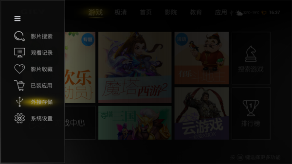二、將U盤插到盒子USB接口,在彈出的窗口中選擇文件夾打開找到安置包;如果沒有自動彈出,那么可以在外界存儲中找到;
