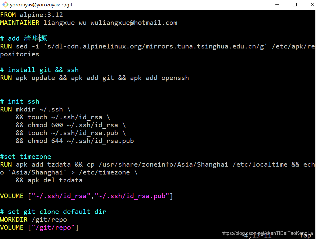 這里簡單說一下,原先提供了一個基于ubuntu 18.04的鏡像,但是體積太大了,所以換成了alpine。國內(nèi)用戶需要把Linux 軟件源切換成國內(nèi)的鏡像,否則在安裝軟件時,會出各種問題。這個鏡像本身是為了clone項目,所以只安裝git和ssh。后面就是為了clone私有倉庫做準(zhǔn)備,并且開放對應(yīng)的ssh目錄卷。由于設(shè)置了工作目錄,因此git clone時默認(rèn)項目是在/git/repo這個目錄下,使用鏡像時,掛載這個目錄即可。