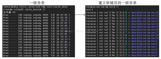 總共含有16*16*16=4096個文件目錄。對該一級目錄進行軟連接,分別將0-f軟連接到你所需要的指定磁盤目錄上,如圖所示: