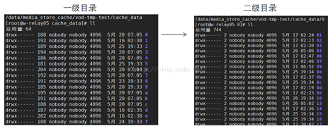2、巧妙得運用proxy_cache_path的目錄結(jié)構(gòu),由于levels=1:2,這導致緩存文件的目錄結(jié)構(gòu)為兩層,每層目錄名,都是由hash函數(shù)生成。如圖所示:
