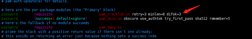 找到如下配置,在后面添加ucredit=-1 lcredit=-1 dcredit=-1 ocredit=-1,它表示密碼必須至少包含一個大寫字母(ucredit),一個小寫字母(lcredit),一個數(shù)字(dcredit)和一個標點符號(ocredit),具體按照需要修改即可