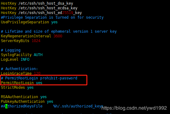 將默認配置注釋掉,添加一行新的配置,默認的配置為允許root登錄,但是禁止root用密碼登錄