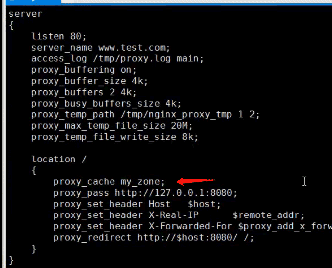 如圖,編譯一個(gè)虛擬主機(jī)的配置文件,在location 里面添加 proxy_cache my_zone;