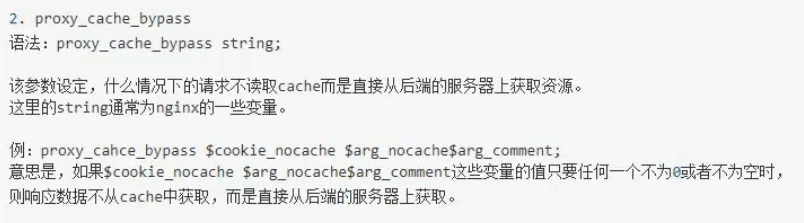 比如 proxy_cache_bypass $cookie_nocache $arg_nocache $arg_comment;