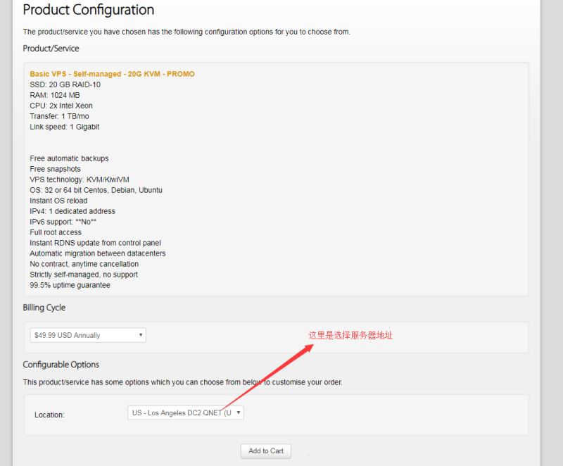 點(diǎn)Order,進(jìn)入購買詳情頁面,選擇服務(wù)地址,我選擇的是洛杉磯的,然后Add to Cart