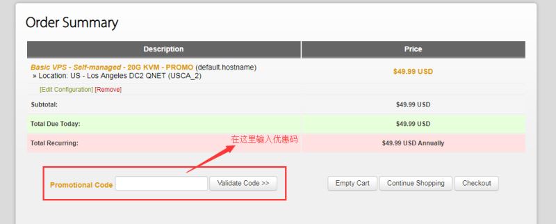 然后進(jìn)行購買結(jié)算,輸入優(yōu)惠碼:BWH26FXH3HIQ- 6.25%(這個(gè)最低目前) 然后點(diǎn)右下角Checkout 進(jìn)行購買