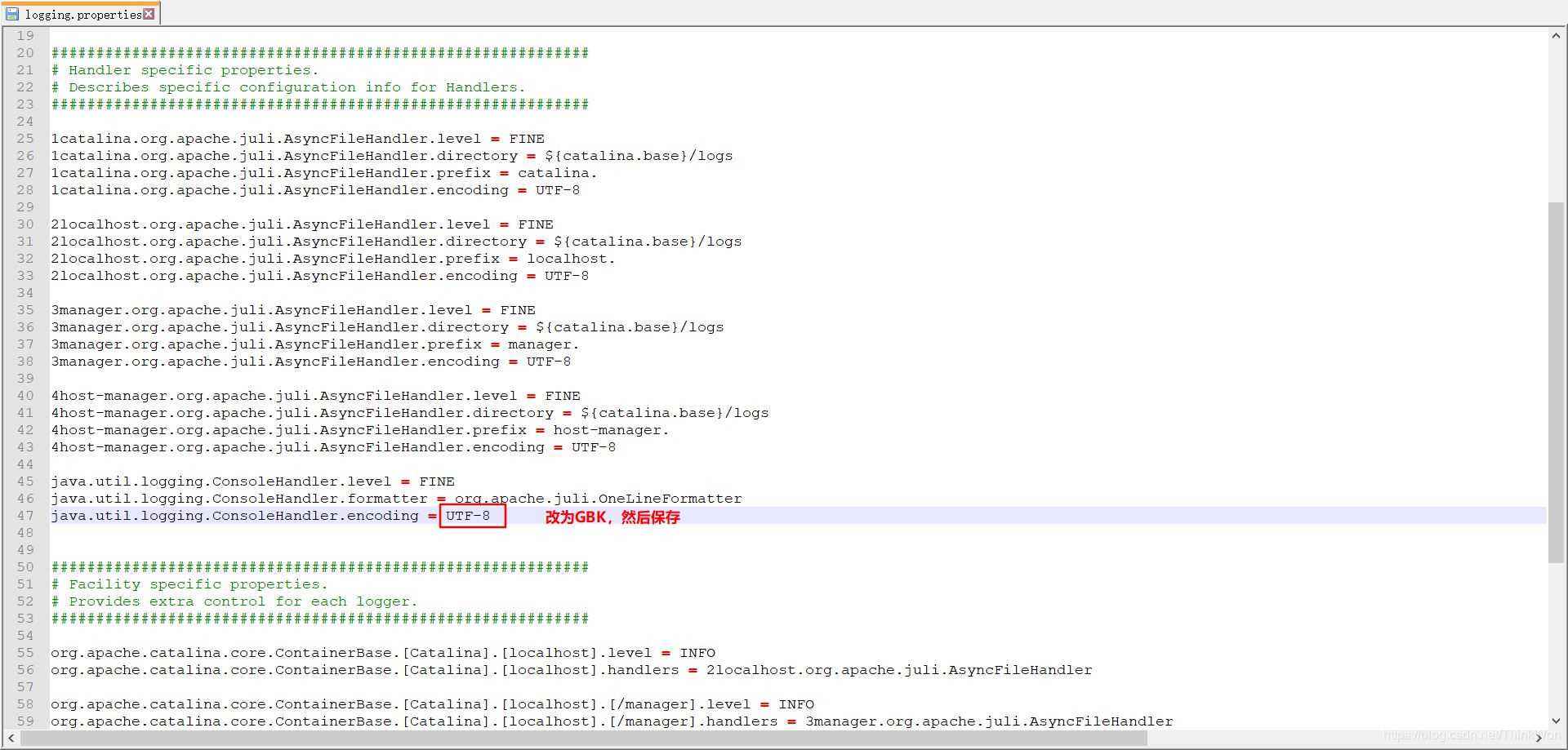 找到Tomcat文件下的conf目錄,修改logging.properties文件中java.util.logging.ConsoleHandler.encoding對應的值為GBK