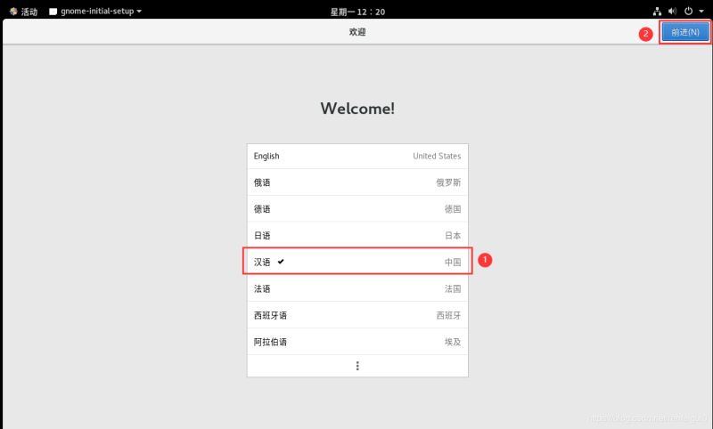7、登錄成功后進(jìn)入圖形化桌面系統(tǒng),選擇漢語(yǔ),點(diǎn)擊前進(jìn)。