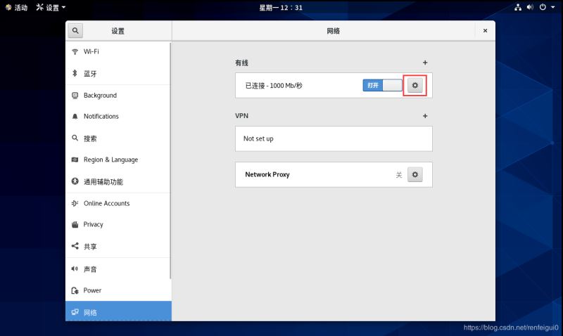 7、啟動(dòng)虛擬機(jī),點(diǎn)擊右上角網(wǎng)絡(luò)圖標(biāo),點(diǎn)擊有線,點(diǎn)擊有線設(shè)置。