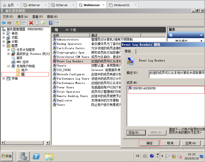 8.打開DCServer服務(wù)器上面的 服務(wù)器管理器找到本地用戶和組然后把ADServer服務(wù)器加入到Event Log Readers日志組里面,點(diǎn)擊添加選擇對(duì)象全部勾選計(jì)算機(jī),然后輸入對(duì)象名稱輸入ADServer然后確定。