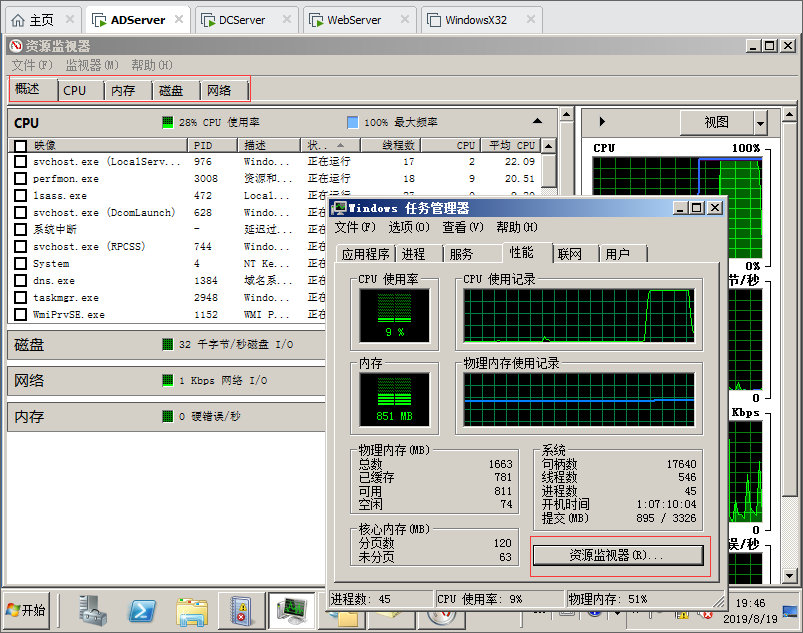 20.性能查看 點(diǎn)擊資源監(jiān)視器可以看到詳細(xì)信息,磁盤 內(nèi)存 網(wǎng)絡(luò)使用率等。