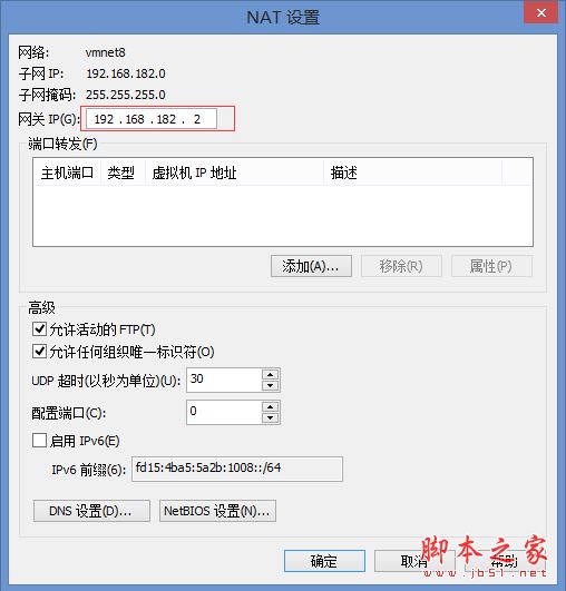 編輯->虛擬網(wǎng)絡(luò)編輯器->更改設(shè)置->選中VM8>點(diǎn)擊NAT設(shè)置,設(shè)置默認(rèn)網(wǎng)關(guān)為192.168.182.2。