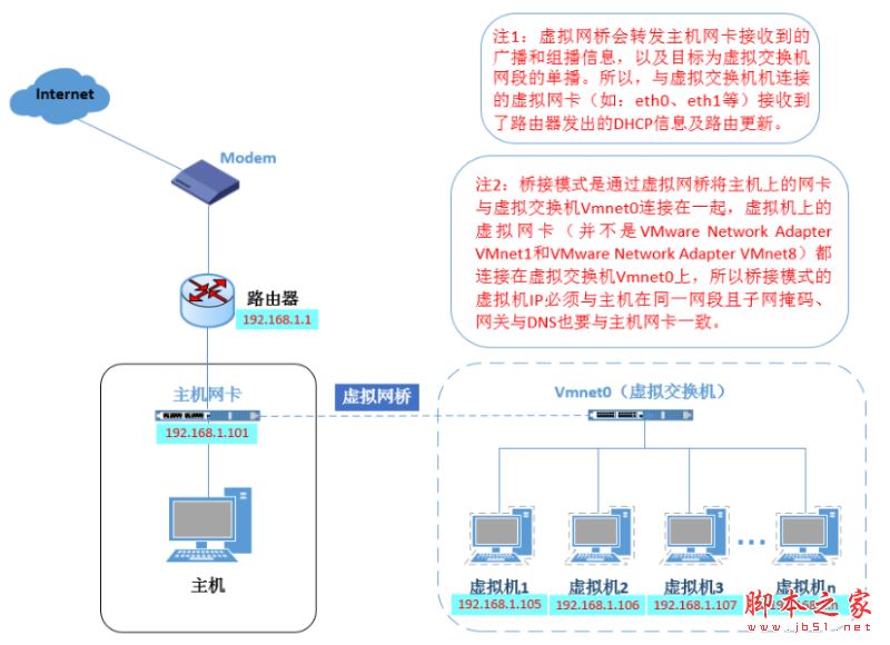 橋接模式相當(dāng)于虛擬機(jī)和主機(jī)在同一個(gè)真實(shí)網(wǎng)段,VMWare充當(dāng)一個(gè)集線器功能(一根網(wǎng)線連到主機(jī)相連的路由器上),所以如果電腦換了內(nèi)網(wǎng),靜態(tài)分配的ip要更改。圖如下: