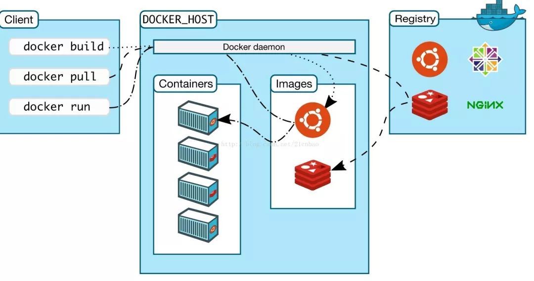 Docker客戶端是Docker的用戶界面,它可以接受用戶命令和配置標(biāo)識(shí),并與Docker daemon通信。圖中,docker build等都是Docker的相關(guān)命令。