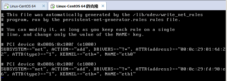 3、 編輯網(wǎng)卡設(shè)備:vi /etc/udev/rules.d/70-persistent-net.rules ,出現(xiàn)以下內(nèi)容,會看到有2塊網(wǎng)卡eth0和eth1,eth0為克隆系統(tǒng)的,eth1為重新生成。