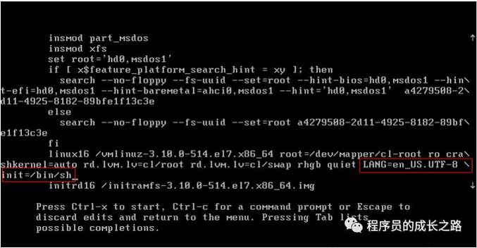 三、將光標(biāo)一直移動到 LANG=en_US.UTF-8 后面,空格,再追加init=/bin/sh。這里特別注意,需要寫在UTF-8后,保持在同一行,并注意空格。有些虛擬機(jī)由于屏幕太小,會自動添加\換行,這個是正常的。