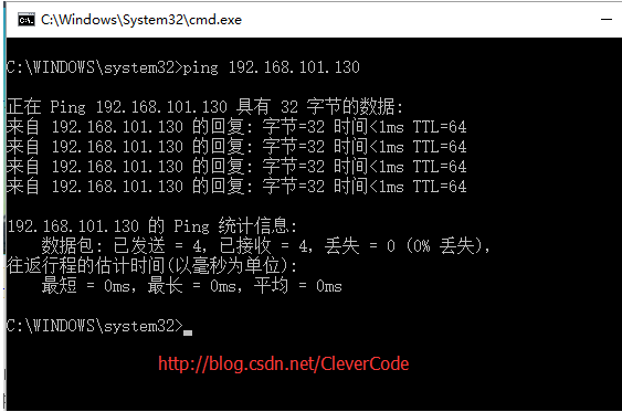 2)本主機(jī)ping虛擬機(jī)。在cmd中ping 192.168.101.130。