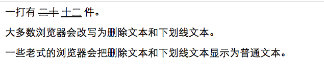 - <p>一些老式的瀏覽器會(huì)把刪除文本和下劃線文本顯示為普通文本。</p>