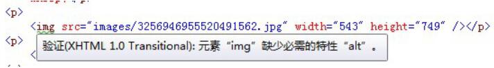 alt 屬性:用來為圖像定義一串預(yù)備的可替換的文本,當(dāng)圖片無法顯示時(shí),就會(huì)顯示alt屬性所定義的文本,在圖片正常顯示時(shí),鼠標(biāo)放上去也會(huì)有懸浮提示,比如“點(diǎn)擊查看大圖”。為頁面上的圖像都加上替換文本屬性(alt)是個(gè)好習(xí)慣,這樣有助于更好的顯示信息,并且對(duì)于那些使用純文本瀏覽器的人來說是非常有用的。而且,現(xiàn)在XHTML1.0標(biāo)準(zhǔn)已經(jīng)強(qiáng)制使用alt屬性。在<img>標(biāo)簽沒有alt屬性時(shí),在VS中會(huì)有如下提示。