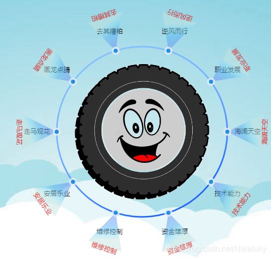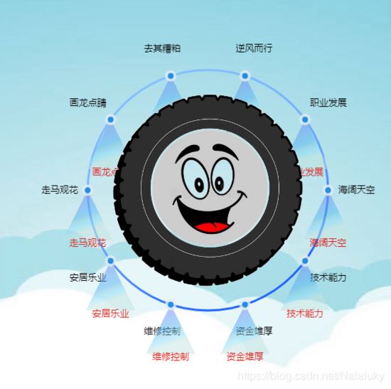 最近筆者有個需求,需求內(nèi)容為:一組文字顯示在圓環(huán)的周圍,用戶可添加文字,文字圍繞著圓環(huán),每個詞對應圓環(huán)周圍的的藍色小圓點,當用戶鼠標放在圓環(huán)上方小藍點時時,實現(xiàn)放射出三角形,再顯示出文字,先看看動圖效果吧!