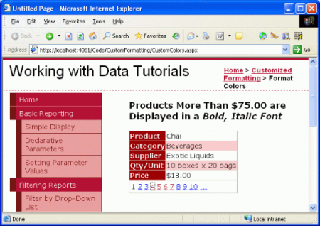 一般在1,2,3之后數(shù)據(jù)將會(huì)通過事件立即填充數(shù)據(jù)控件,我們還可以自定義事件處理來確定數(shù)據(jù)是否已經(jīng)被填充到控件中并按照我們的需要調(diào)整顯示格式。我們可以來做個(gè)例子.我們將創(chuàng)建一個(gè)DetailsView來列出一個(gè)產(chǎn)品的一般信息,并且當(dāng)UnitPrice超過 $75.00 時(shí)用粗體,italic字體來顯示UnitPrice的值