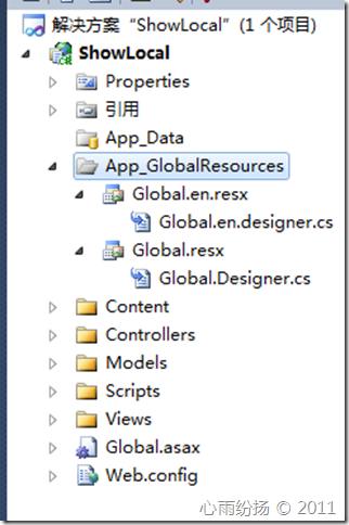 現(xiàn)在我需要做的是把所有的內(nèi)容從頁(yè)面和控制器里分離出來(lái),Asp.Net給我們一個(gè)名為App_GlobalResources的文件,它里面包含各種語(yǔ)言的全局資源文件。我們只需要在解決方案管理器里的Web項(xiàng)目上右擊鼠標(biāo),添加->添加至Asp.Net文件夾->App_GlobalResources