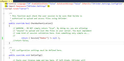 打開(kāi)ckfinder目錄下的config.ascx,第一個(gè)方法是驗(yàn)證授權(quán)的,看用戶是否有權(quán)限上傳文件,可以通過(guò)驗(yàn)證 session,驗(yàn)證用戶是否被授權(quán),默認(rèn)是return false;如果不加修改,直接使用在上傳時(shí)會(huì)報(bào)錯(cuò),沒(méi)有授權(quán)無(wú)法上傳,如果測(cè)試階段可以直接改為return true; 但發(fā)布的話最好要驗(yàn)證權(quán)限,不要直接return true(我在這里驗(yàn)證用戶是否已經(jīng)登錄,如果登錄則返回true,否則返回false)