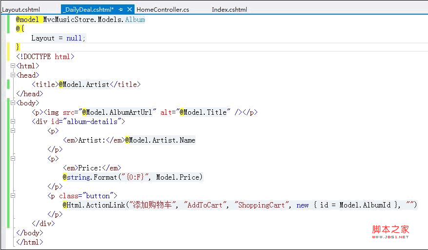 (4)Ajax操作連接的目標(biāo)操作的返回值是純文本或HTML。下面的Razor代碼就在項(xiàng)目的Views/Home文件夾下的_DailyDeal.cshtml文件中。