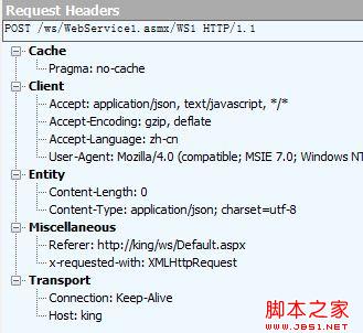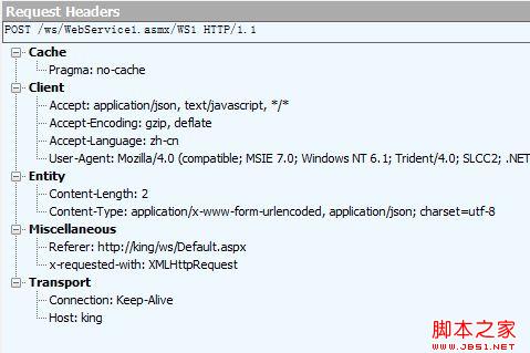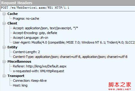 那么在IE發(fā)送的Requst Headers就如下圖所示,你會看到Content-Type有兩個用逗號隔開的值,這是為什么呢?因?yàn)?,jquery為Content-Type設(shè)置了一次值,我們手工又設(shè)置一次,而在IE是多次設(shè)置Content-Type的值它會追加,而不是替換,不過這并不影響WebService正確返回 JSON數(shù)據(jù)給我們,不過應(yīng)該避免這種情況出現(xiàn)。