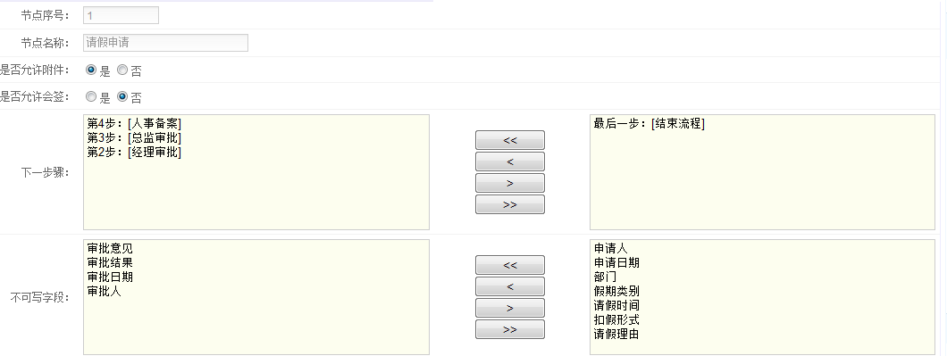 節(jié)點序號:用來表示當前流程為第幾步,節(jié)點名稱用來標識當前步驟名稱,是否允許附件、會簽,用來控制附件與會簽區(qū)的顯示和隱藏。下一步標識當前步驟可以流轉(zhuǎn)到哪些步驟,左邊是已經(jīng)選擇好了的(可以是多個步驟,這里考慮的是,不同的職位使用相同的流程會有特殊情況發(fā)生,譬如正常的流程是需要四步[員工填寫》經(jīng)理審批》總監(jiān)審批》人事備案],但是當總監(jiān)請假的時候就不需要這么多步驟[填寫表單》人事備案]),右邊是拉取當前流程下的所有步驟。不可寫字段標識,當前步驟時,表單有哪些節(jié)點為不可以填寫,譬如:員工填寫請假申請單,流轉(zhuǎn)到經(jīng)理時,那么經(jīng)理看到的表單就有員工姓名、部門等信息不能填寫,只能填寫審批意見等節(jié)點信息。這樣流程與表單就關聯(lián)好了,接下來就是工作流流轉(zhuǎn)了。