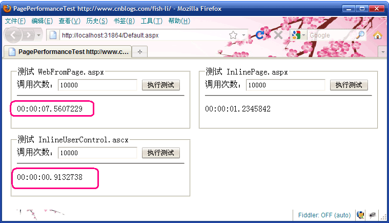 因為從HttpWebRequest發(fā)起調用到獲取結果,這其中除了有頁面的執(zhí)行時間,還混雜較多的額外調用開銷。最終,我選擇了在一次HTTP請求中,循環(huán)調用Server.Execute來執(zhí)行頁面,并統(tǒng)計時間的方式。其實如何選擇測試方法,對于二個測試對象還說,都是公平的。只是說:盡量減少一些額外的調用開銷,會讓測試結果的差異更大,也更明顯。