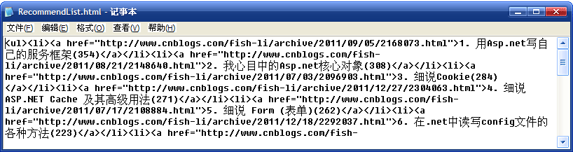 我復制了我的博客側邊欄的【推薦排行榜】的那段HTML代碼,保存到一個文件中:
