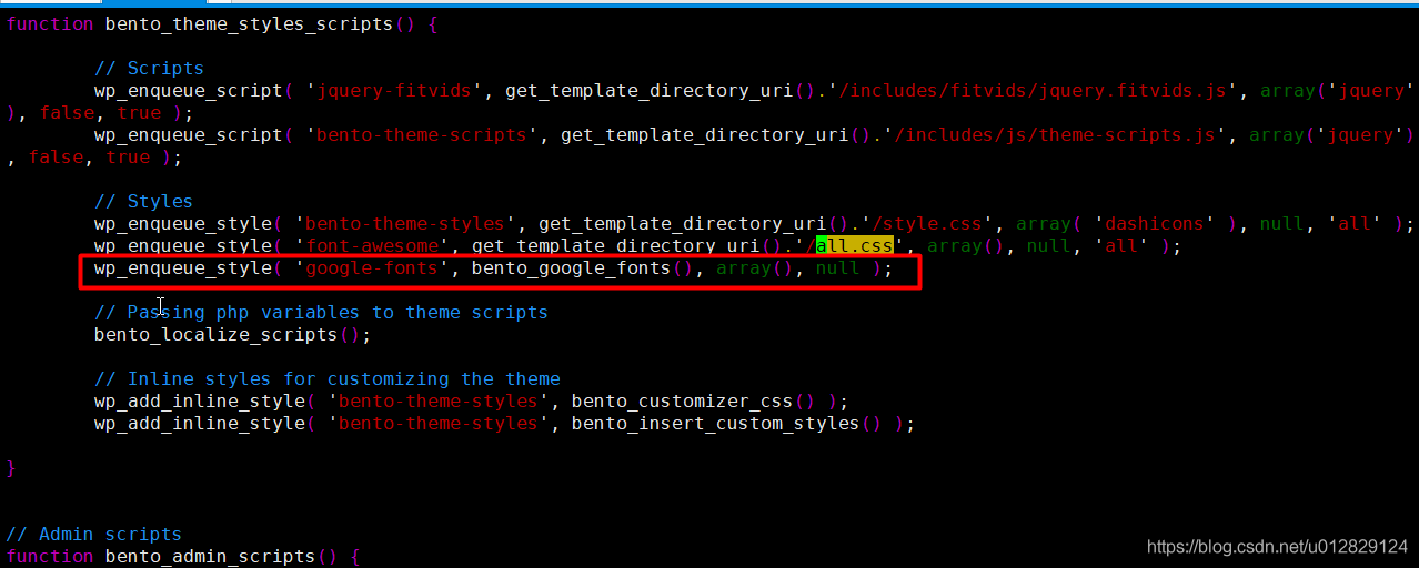 查看functions.php內容,并定位到all.css位置,通過分析找出加載google的css代碼