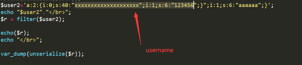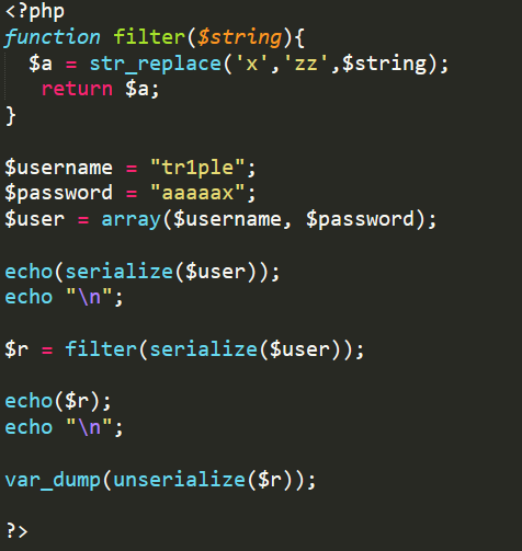 他會使得輸入的相應(yīng)字符變?yōu)榭?,也就是讓序列化后的字符串變短,我們就可以利用此來吞掉原本的變量名,而注入我們想注入的代碼。