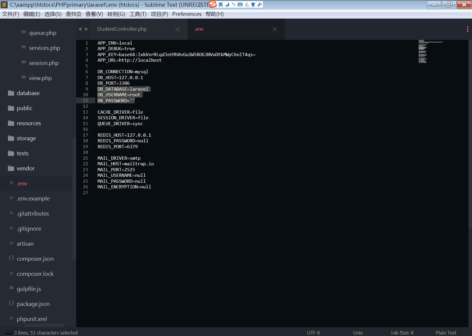 在這里,我們需要用到的有兩個(gè)文件,第一個(gè)是congfig目錄下的database.php,以及Laravel目錄下的env文件