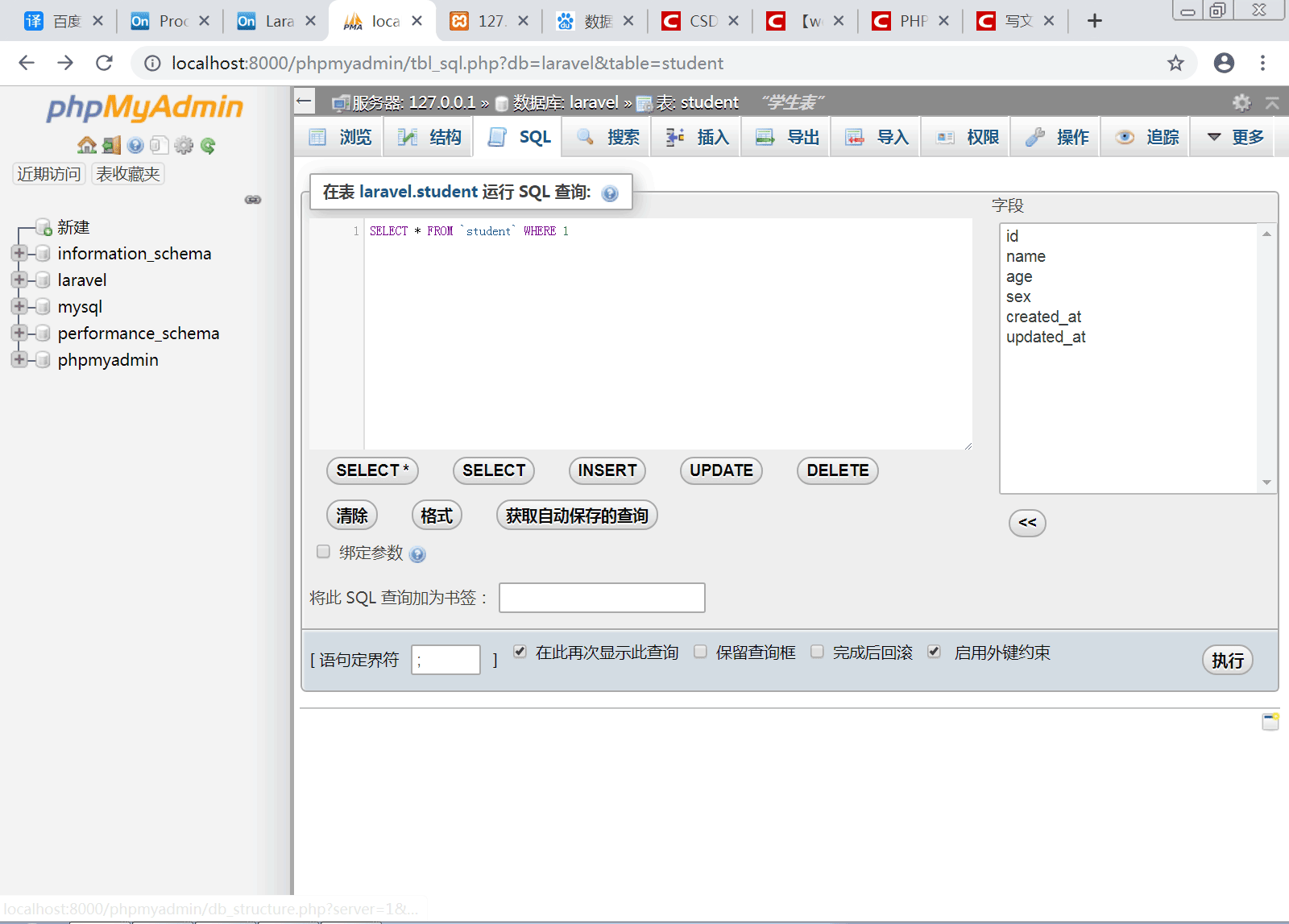 然后在laravel數(shù)據(jù)庫下面添加一個(gè)數(shù)據(jù)表,并命名為student,然后點(diǎn)擊sql