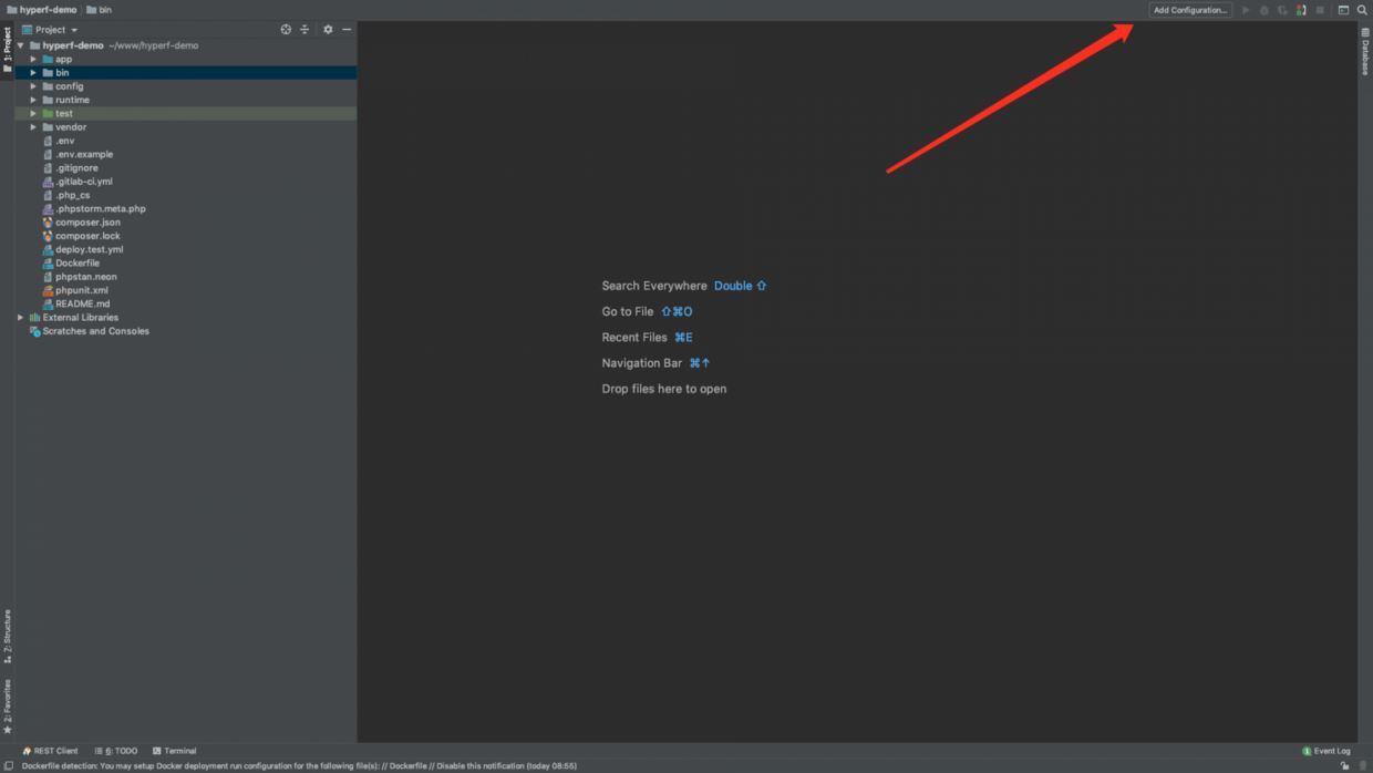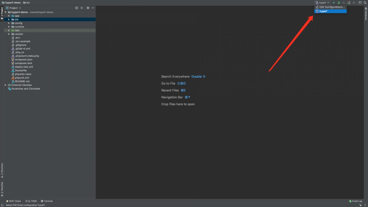 使用我們剛剛配置好的腳本信息,點擊 PhpStorm 右上角,選中剛剛配置的 Hyperf 腳本,如圖: