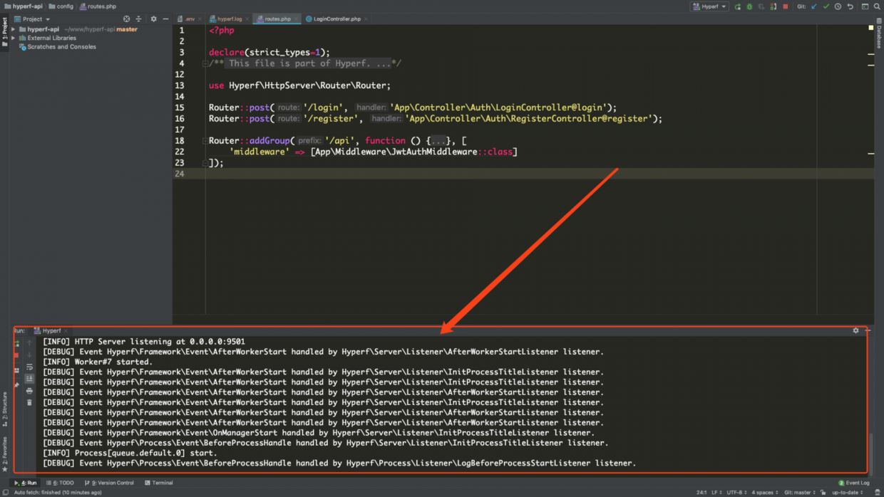 選中后,點擊旁邊的開始按鈕,既可以運行 Hyperf 了,,如圖: